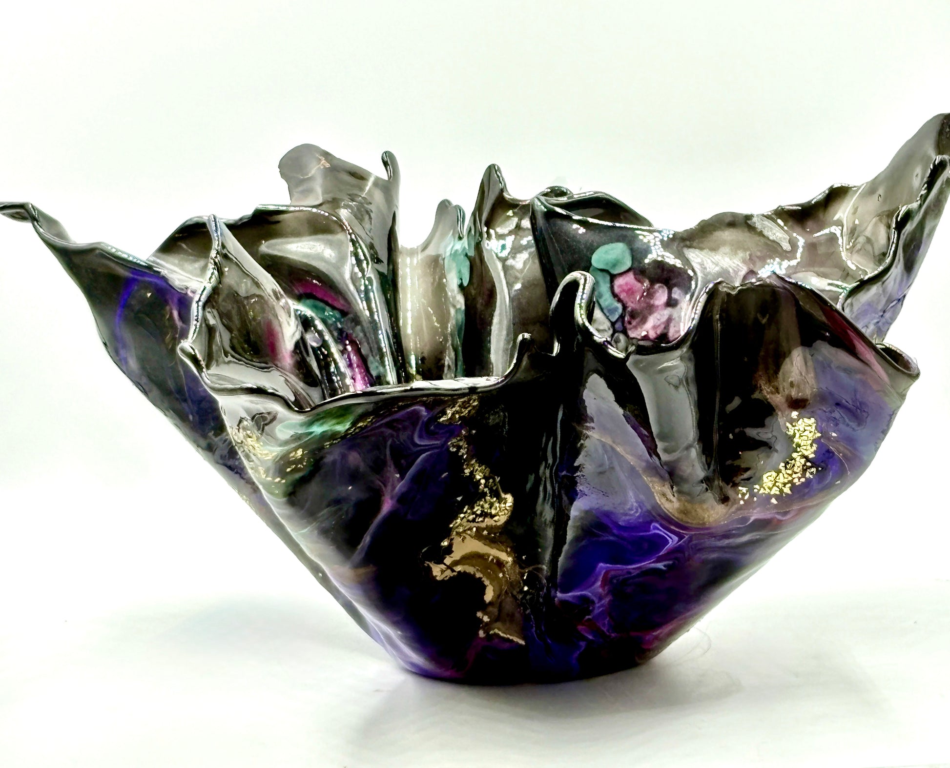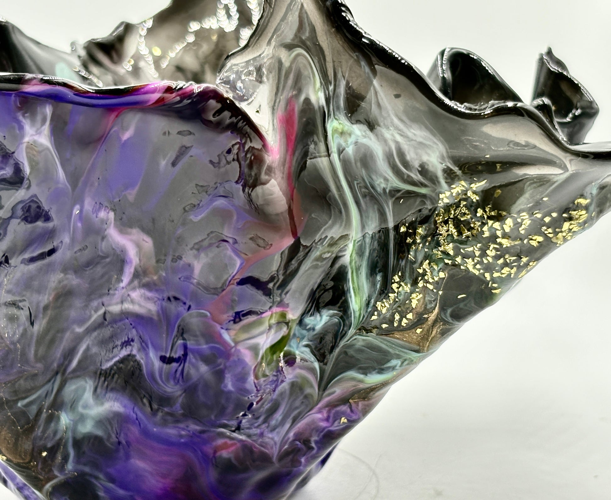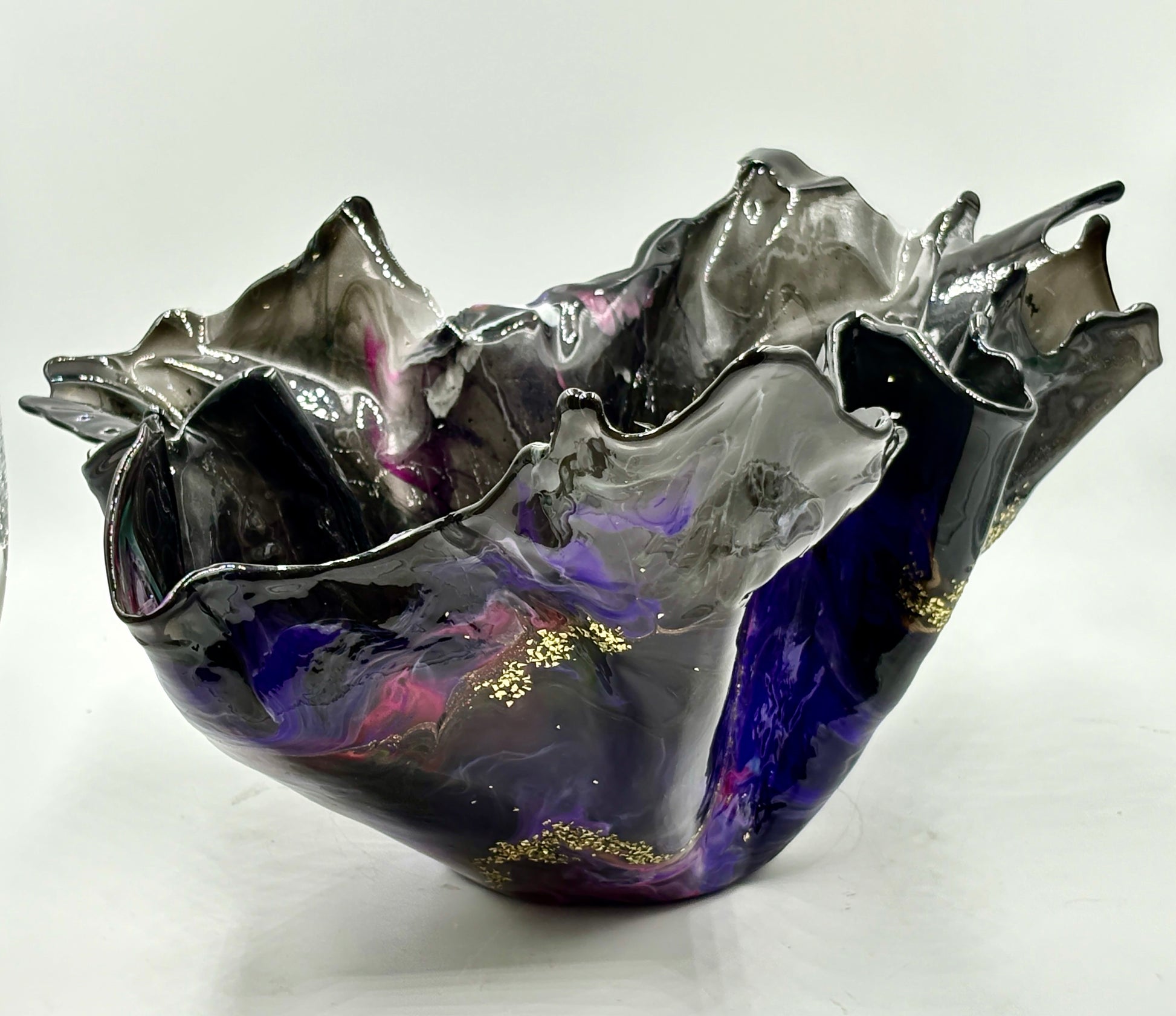 This striking black resin bowl features elegant purple and gold accents, creating a contemporary piece that enhances any space. Measuring 13 inches across at its widest point and approximately 8 inches high, its free-form design offers both artistic appeal and functional versatility. Ideal for display or serving, this bowl combines modern aesthetics with durable craftsmanship.