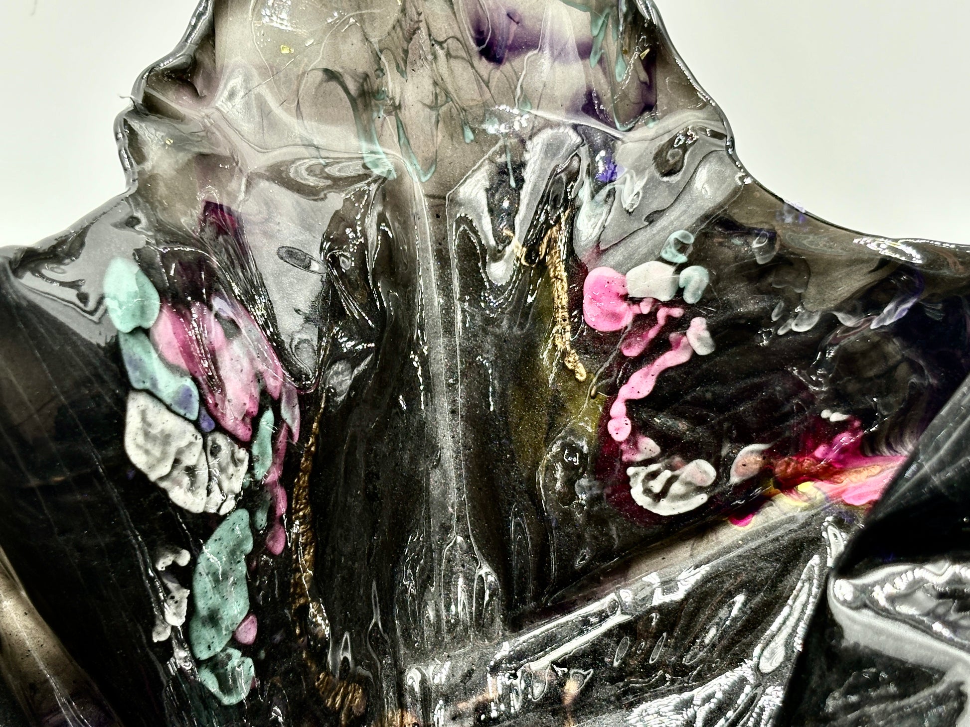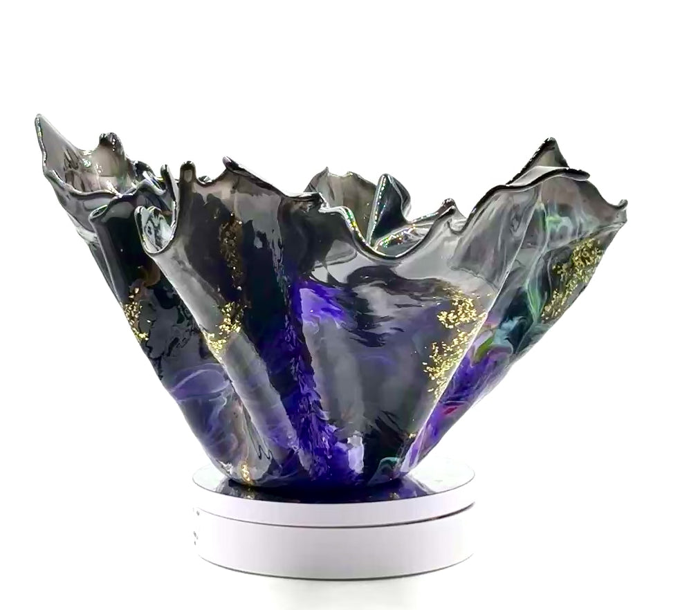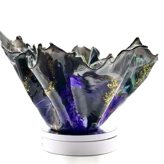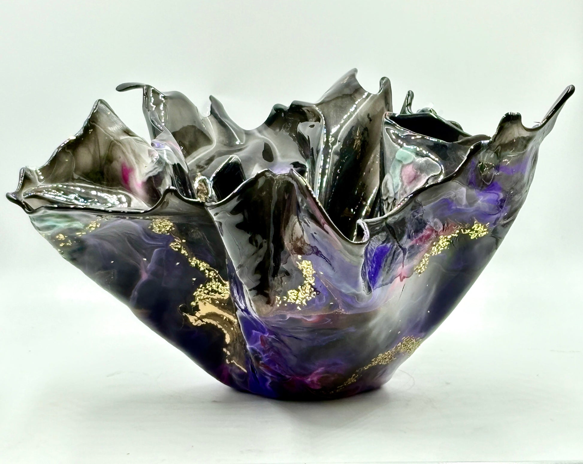 This striking black resin bowl features elegant purple and gold accents, creating a contemporary piece that enhances any space. Measuring 13 inches across at its widest point and approximately 8 inches high, its free-form design offers both artistic appeal and functional versatility. Ideal for display or serving, this bowl combines modern aesthetics with durable craftsmanship.