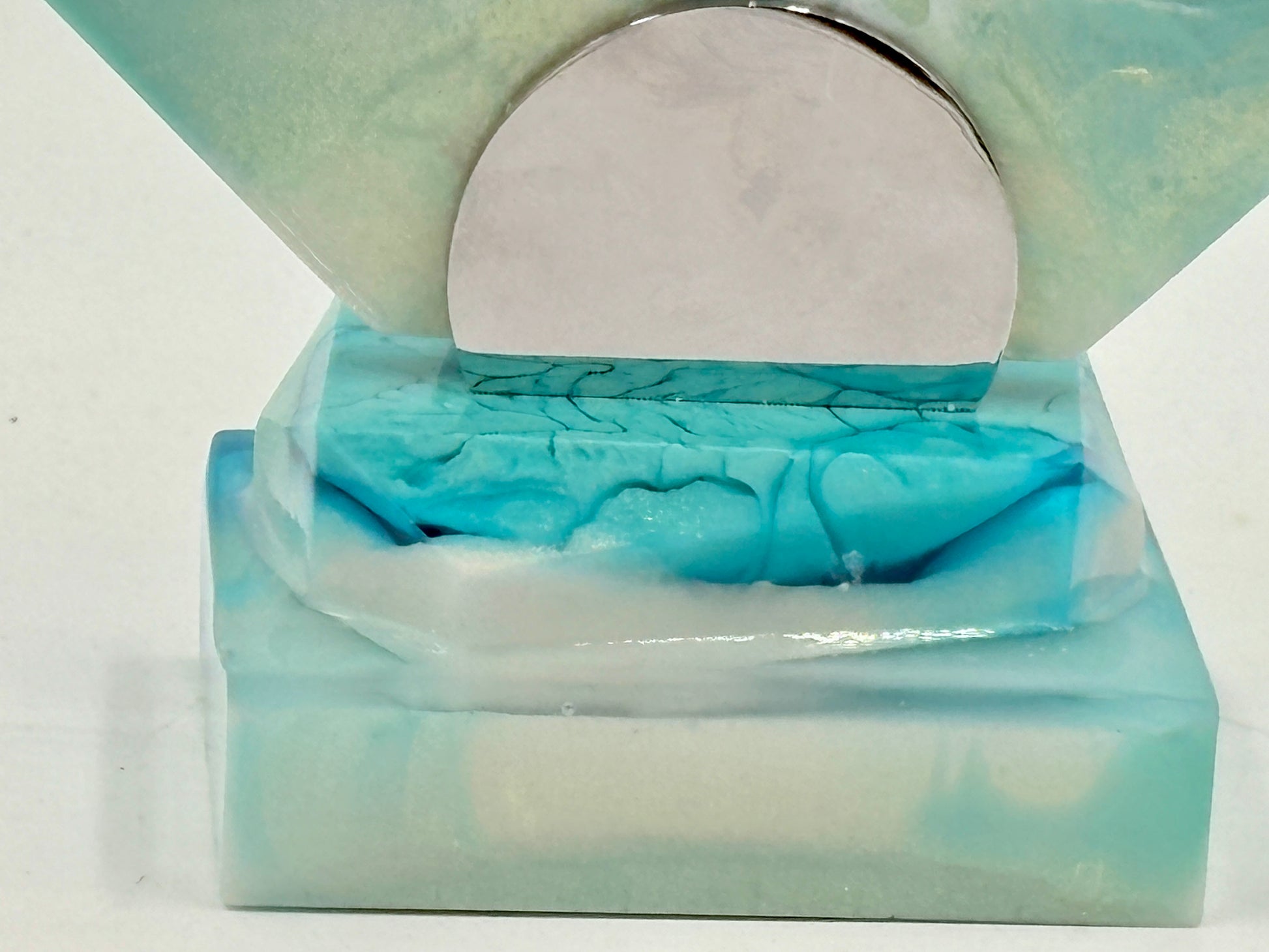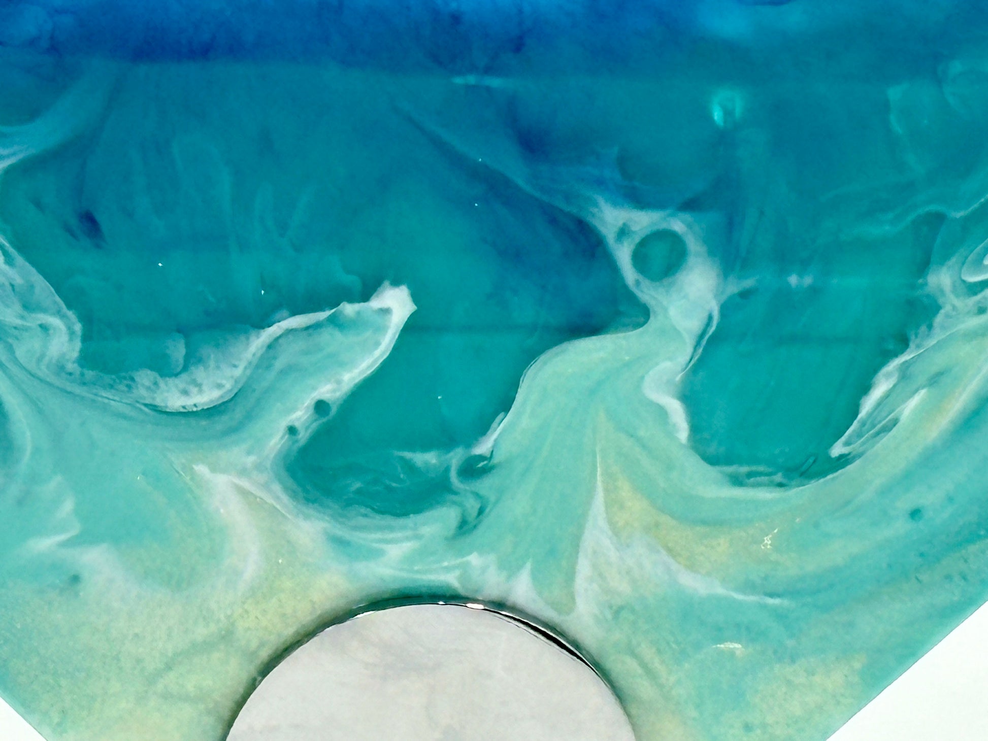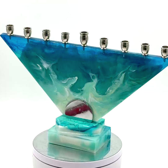 This one-of-a-kind Hanukkah menorah captures the essence of coastal serenity with its striking blue palette and flowing ocean wave design. Handcrafted in resin, each piece showcases contemporary artistry while honoring tradition. Silver-accented cups cradle the candles with understated elegance, while the silver-detailed base grounds the composition with refined sophistication. A distinctive functional art piece that brings modern aesthetic sensibility to your holiday observance.