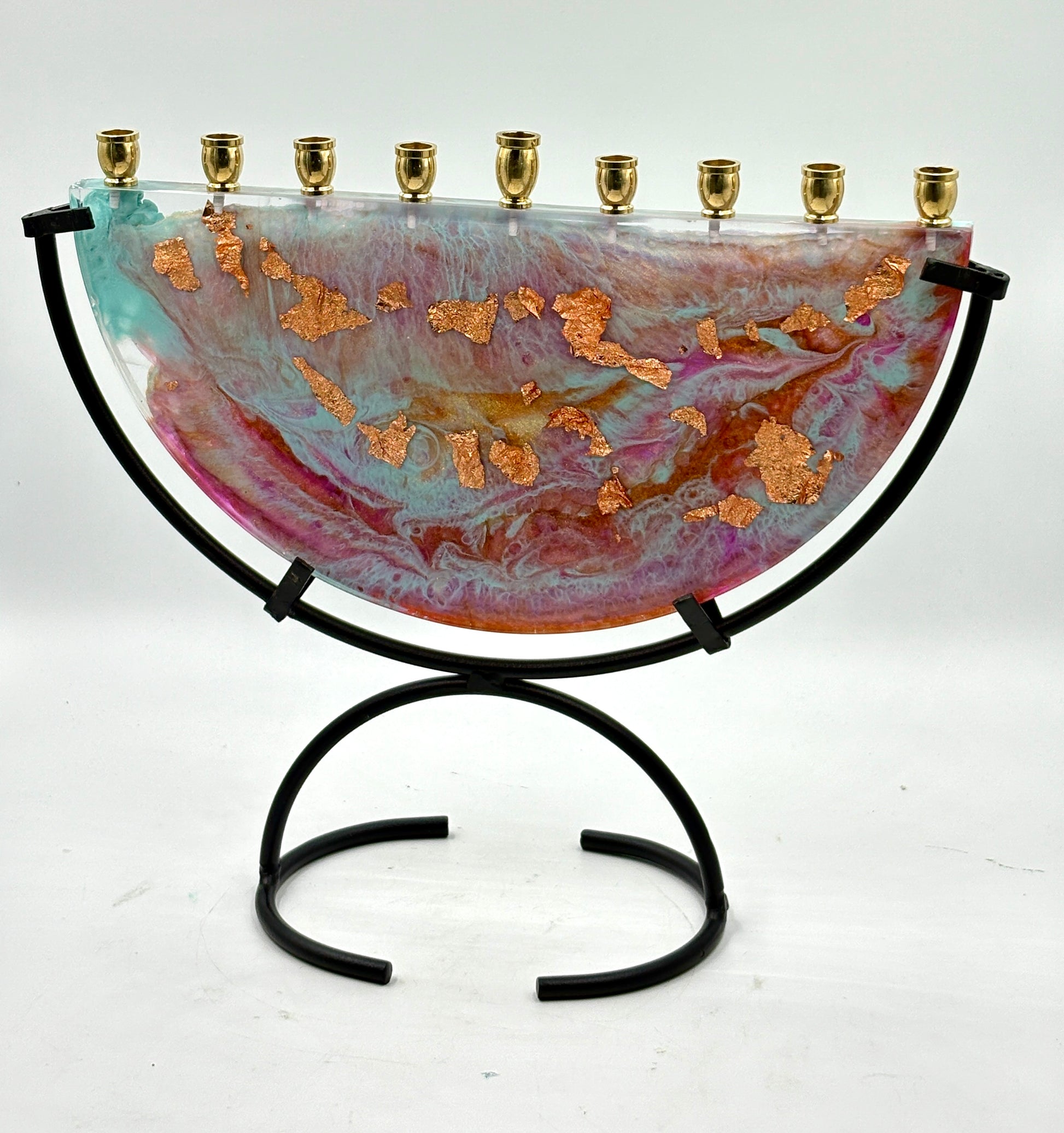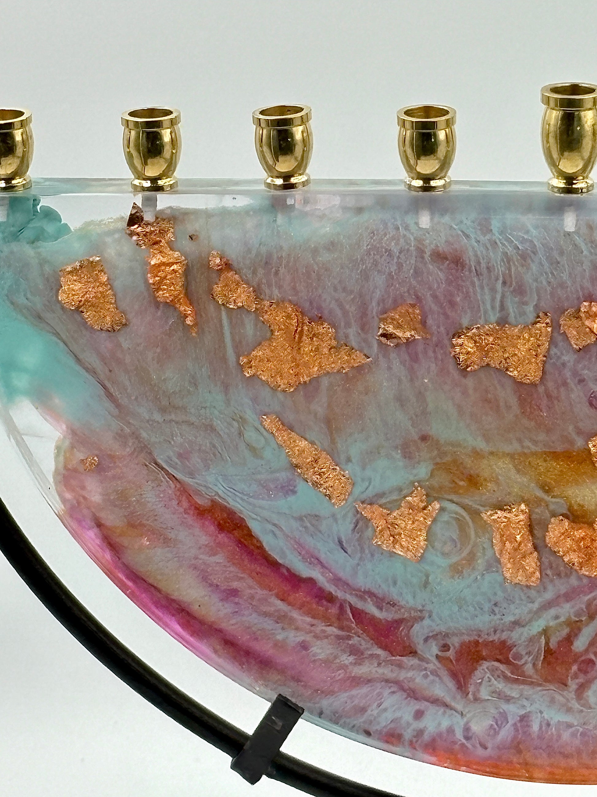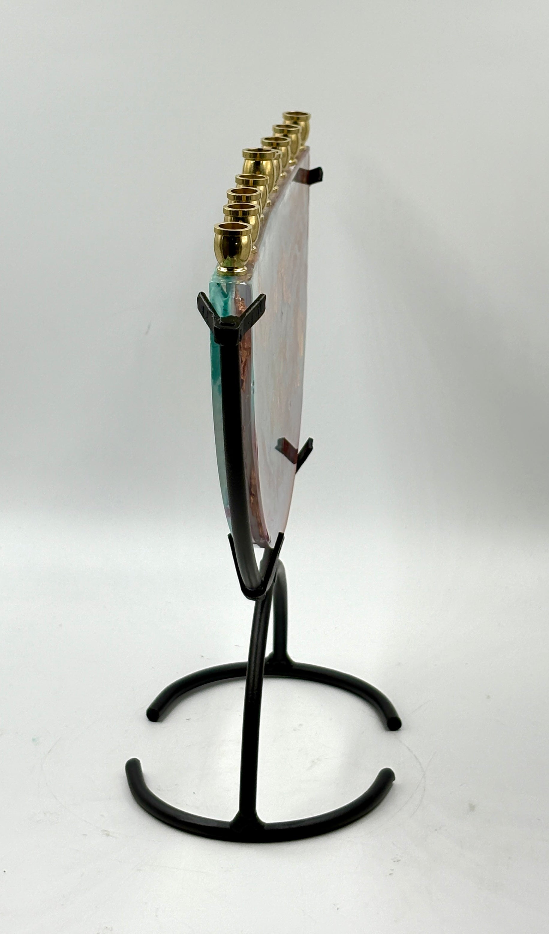 This Hanukkah menorah features a sturdy black wrought iron stand supporting a resin body in striking blues, golds, and rose hues. One side is elegantly gilded in gold, creating a beautifully different design on each side for versatile display options. The gold candle cups add a luxurious finish, making this menorah a distinguished centerpiece that combines artistry with tradition for your holiday celebrations.