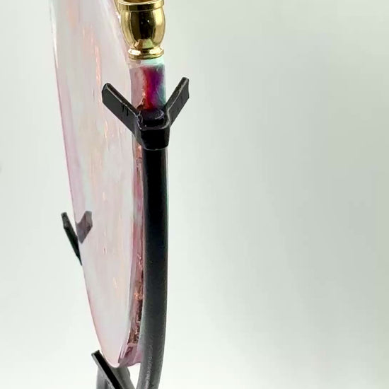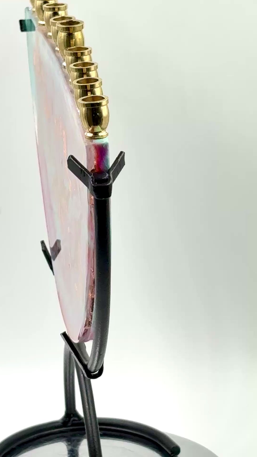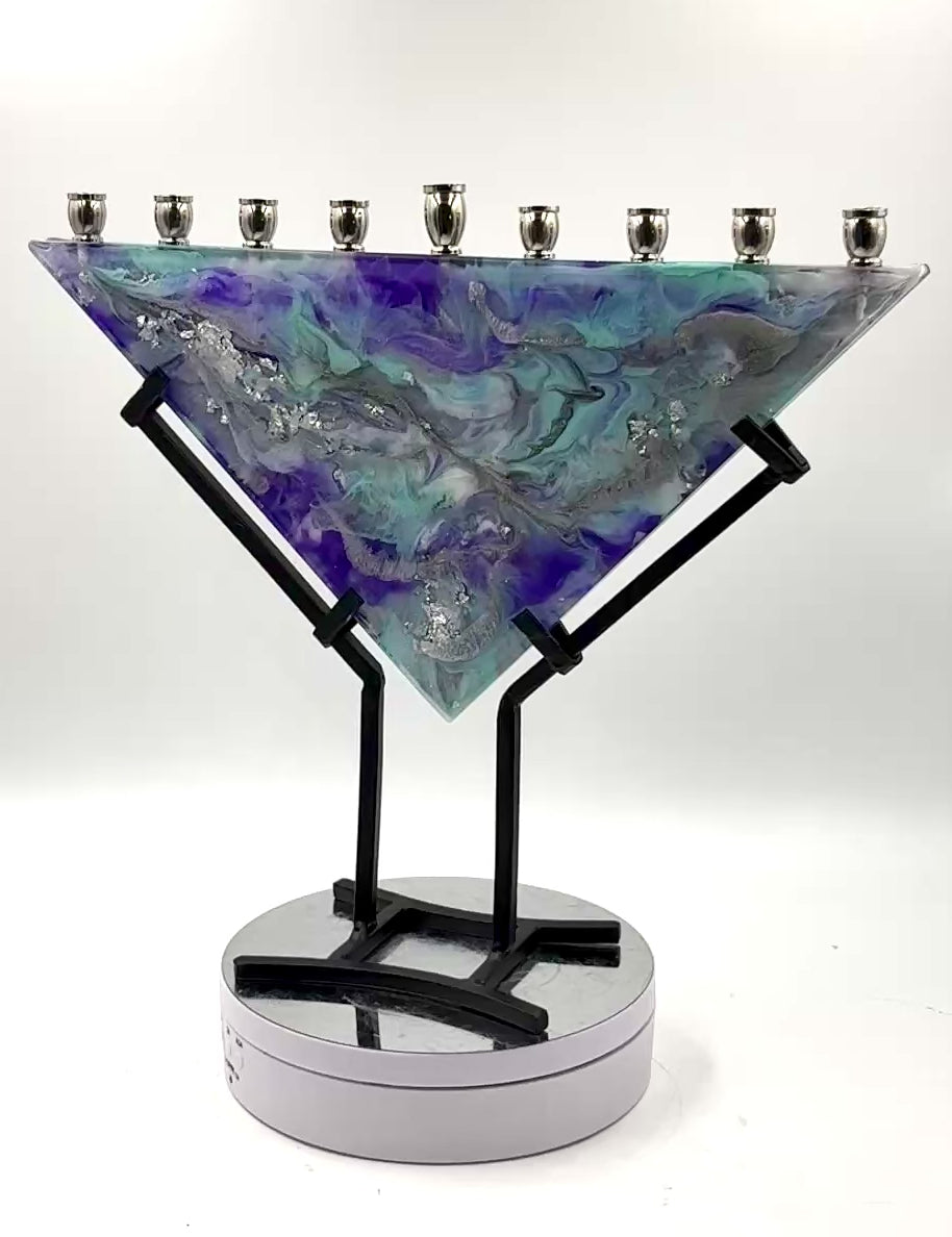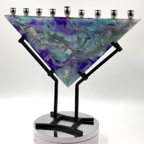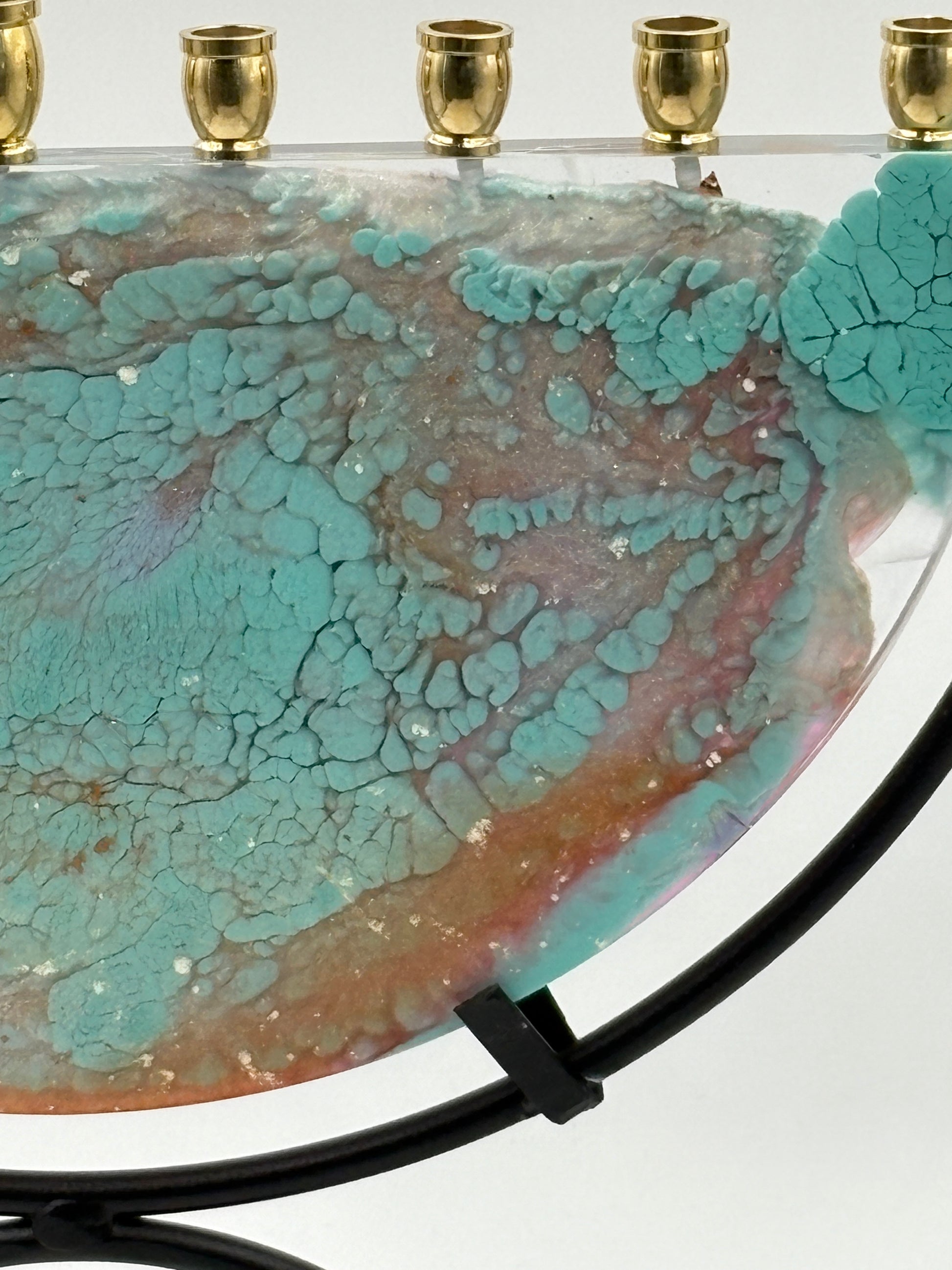 This Hanukkah menorah features a sturdy black wrought iron stand supporting a resin body in striking blues, golds, and rose hues. One side is elegantly gilded in gold, creating a beautifully different design on each side for versatile display options. The gold candle cups add a luxurious finish, making this menorah a distinguished centerpiece that combines artistry with tradition for your holiday celebrations.