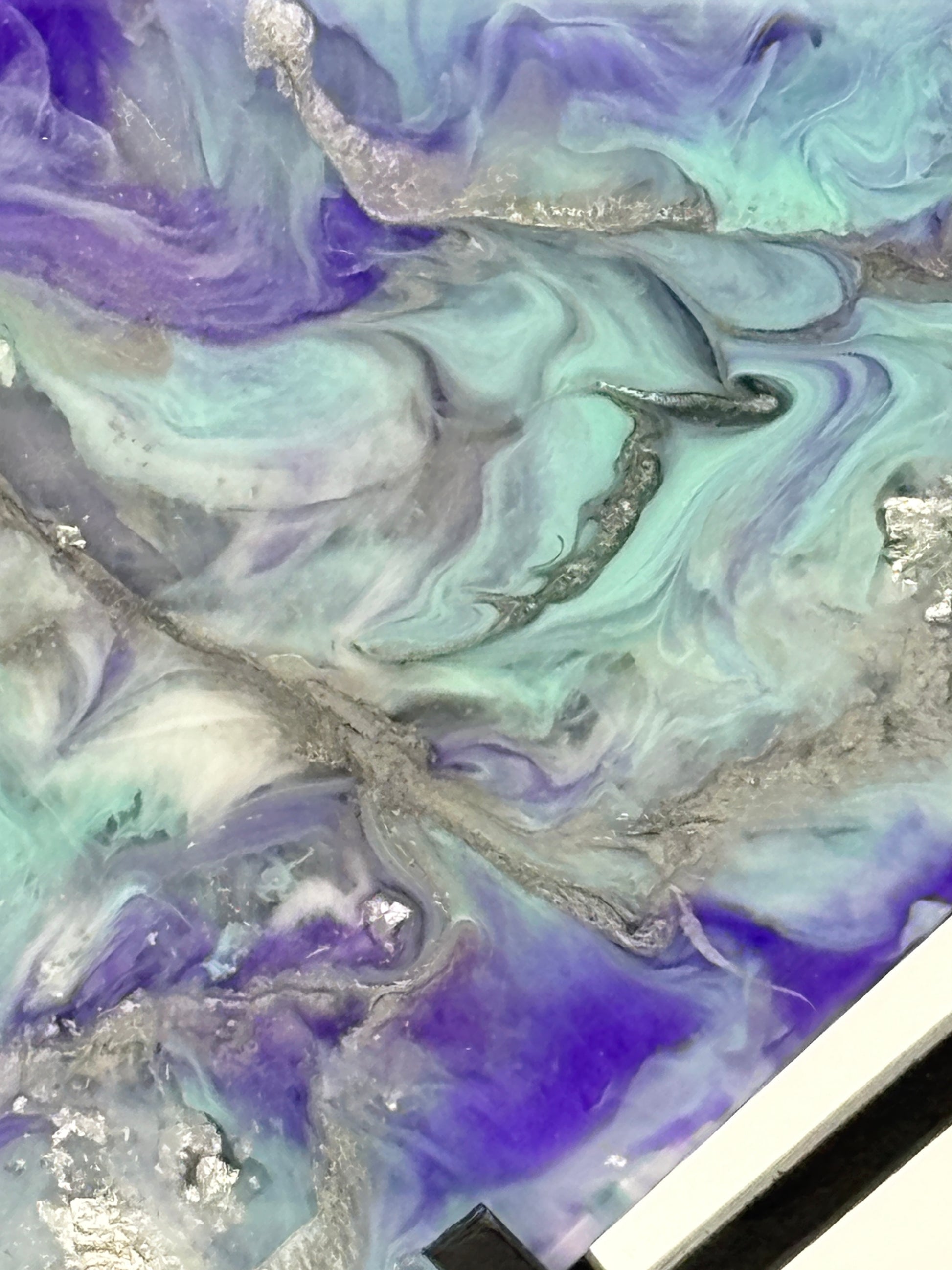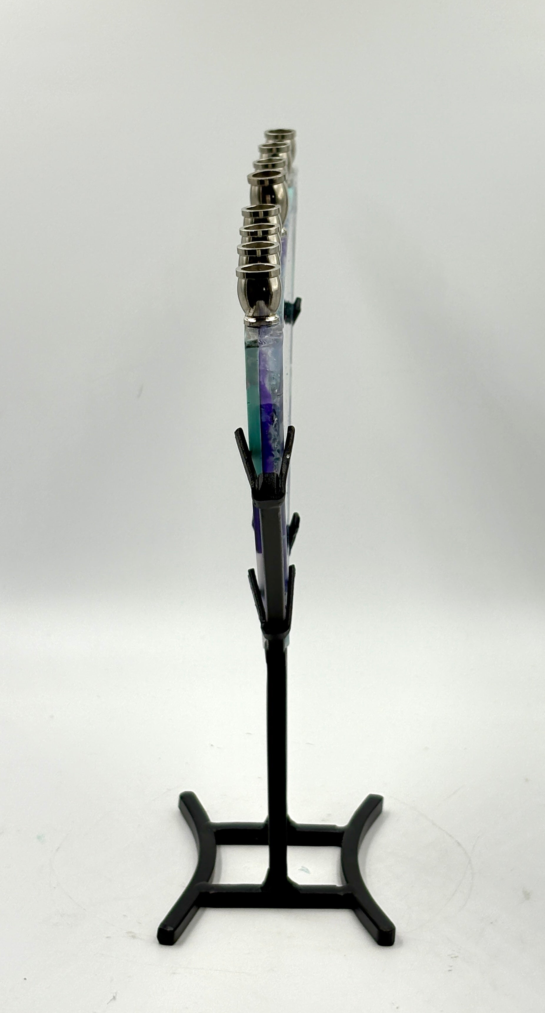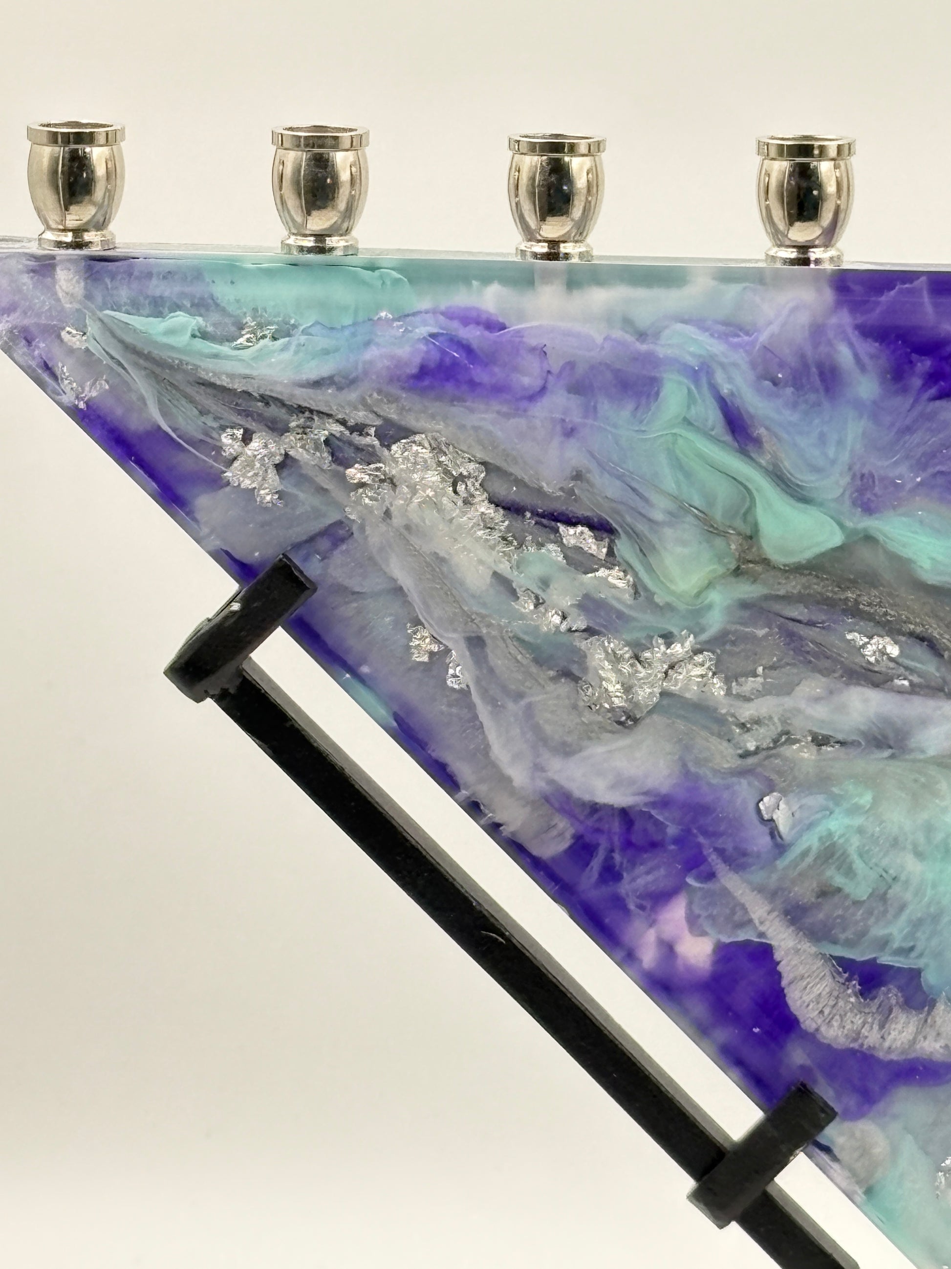 This Hanukkah menorah showcases a unique triangular design mounted on a black wrought iron stand. Featuring a palette of blues and purples accented with silver details, it offers a modern yet refined aesthetic. Silver candle cups complete the look, providing a sleek and elegant touch to your holiday table.