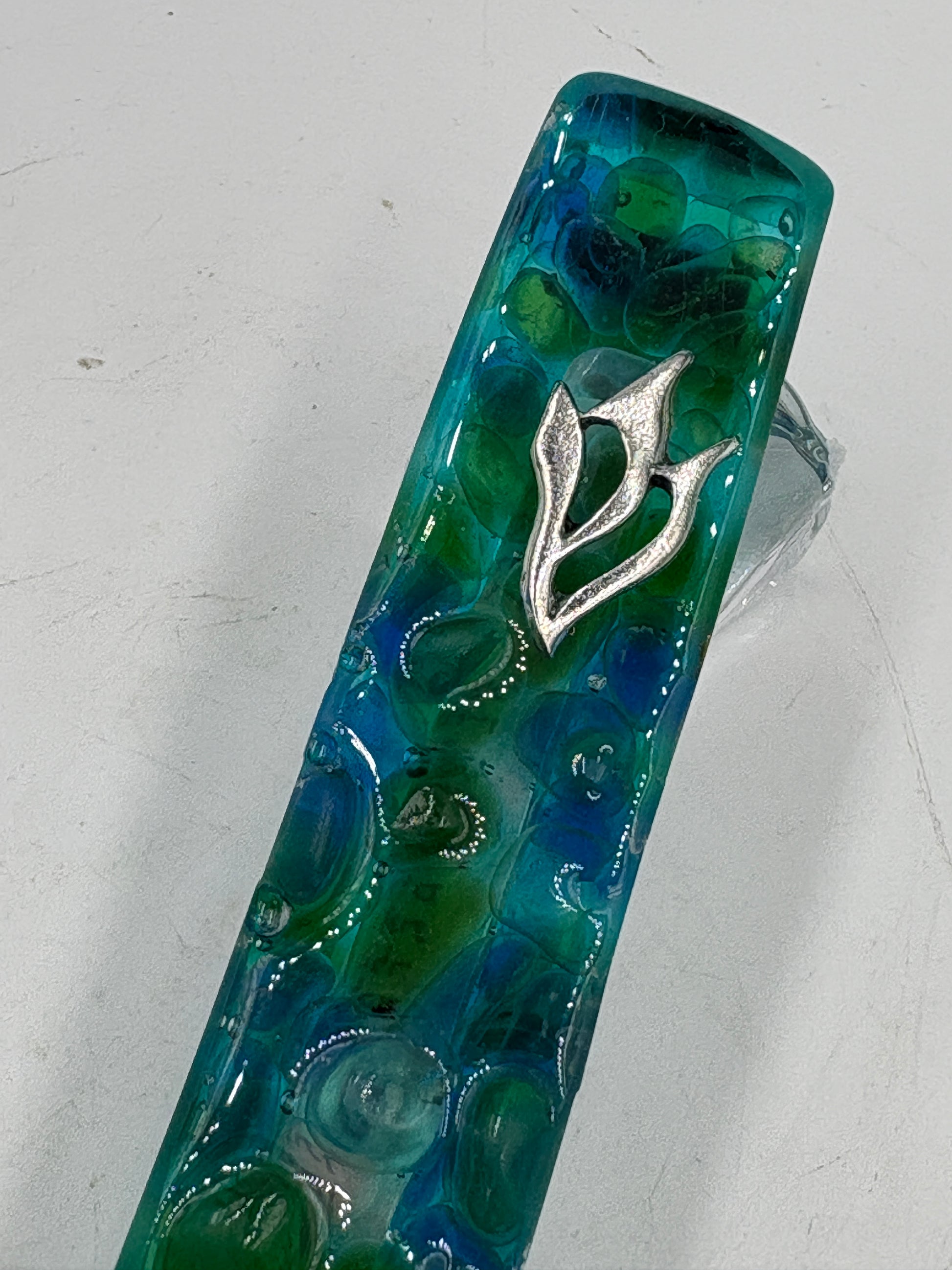 This unique resin mezuzah features a blend of blue hues with blue and green sea glass, highlighted by a traditional silver shin. It includes a non-kosher scroll and has a self-adhesive backing for easy and secure attachment to your doorframe. Crafted for both beauty and practicality, it adds a distinctive touch to your home entryway.