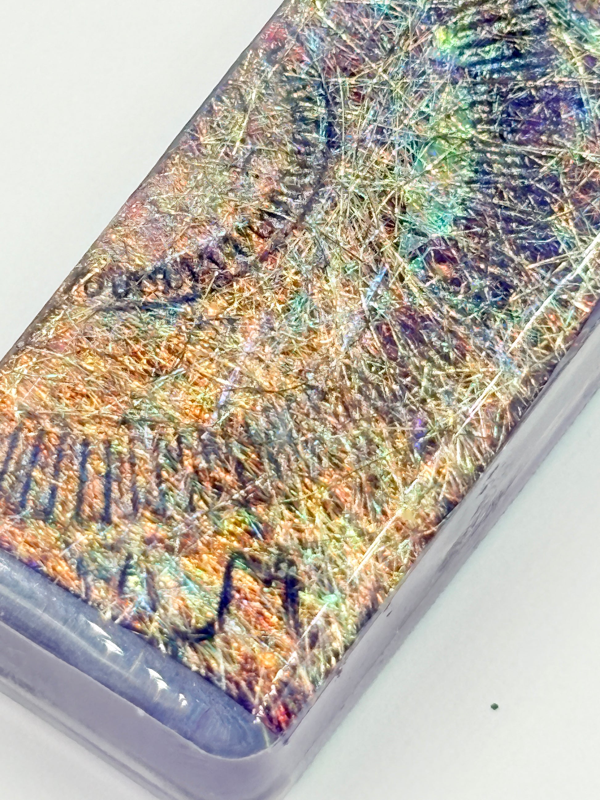 This one-of-a-kind mezuzah combines traditional Jewish craftsmanship with contemporary artistry. Hand-crafted from resin and enhanced with dichroic film, each piece features unique embossed patterns that catch and refract light in captivating ways. The vibrant, colorful design makes a striking statement while honoring the sacred blessing contained within. Measuring 0.75" x 5.5", it's perfectly proportioned for doorway installation. An exceptional choice for those seeking a meaningful, visually distinctive piece that celebrates both faith and artistic expression. Selfstick adhesive on backfor hanging.