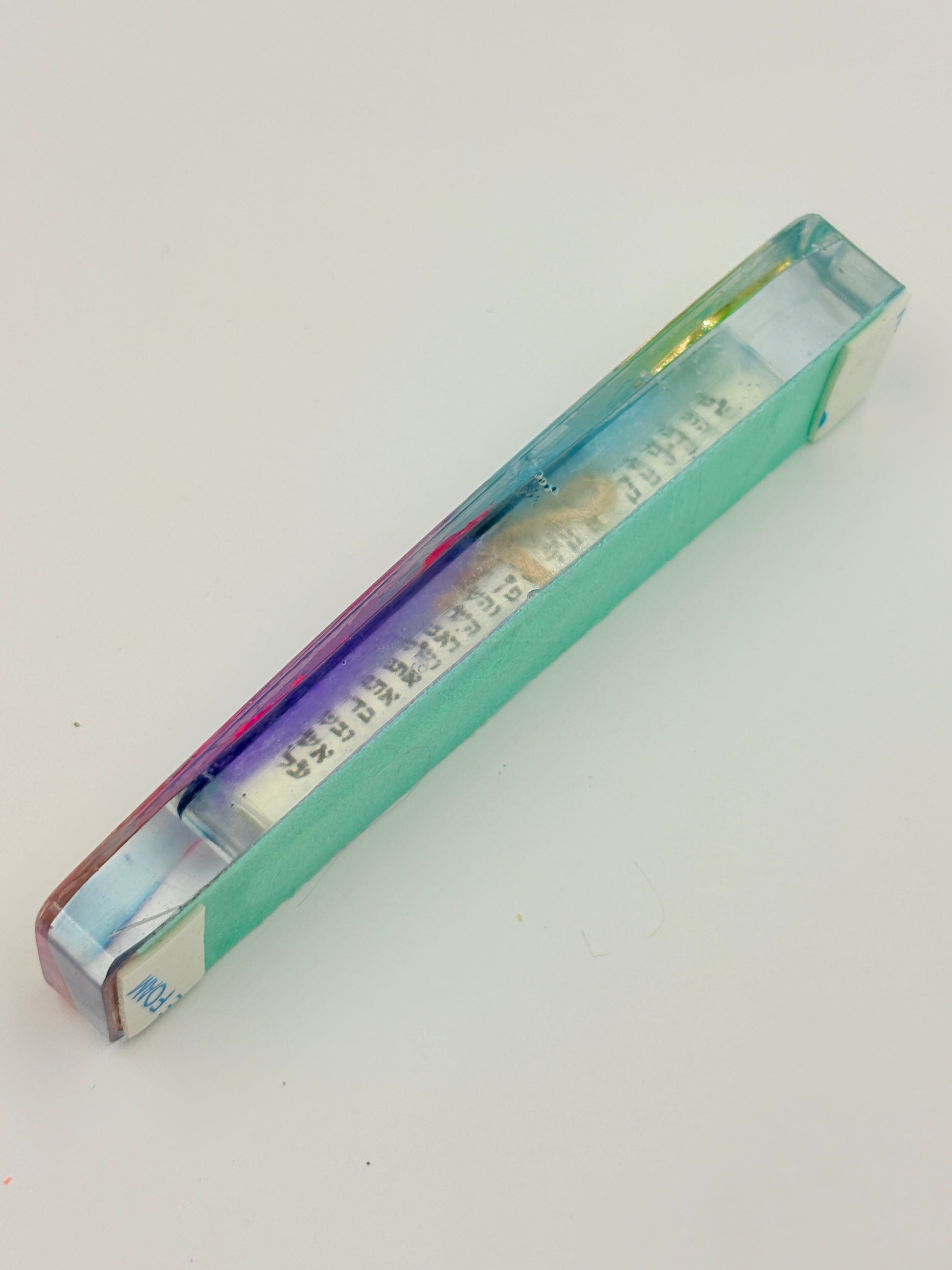 This one-of-a-kind mezuzah combines traditional Jewish craftsmanship with contemporary artistry. Hand-crafted from resin and enhanced with dichroic film, each piece features unique embossed patterns that catch and refract light in captivating ways. The vibrant, colorful design makes a striking statement while honoring the sacred blessing contained within. Measuring 0.75" x 5.5", it's perfectly proportioned for doorway installation. An exceptional choice for those seeking a meaningful, visually distinctive piece that celebrates both faith and artistic expression.