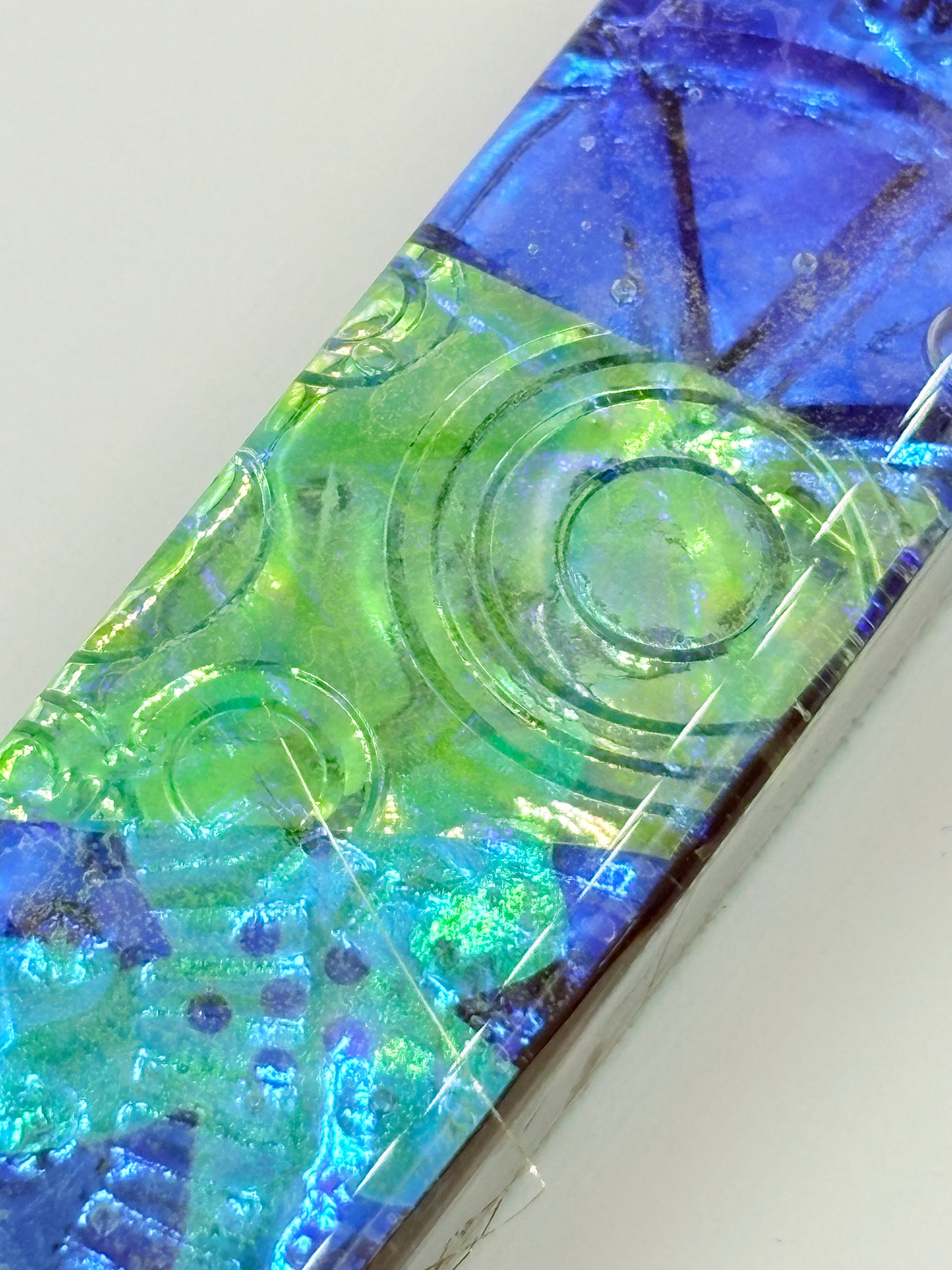 This one-of-a-kind mezuzah combines traditional Jewish craftsmanship with contemporary artistry. Hand-crafted from resin and enhanced with dichroic film, each piece features unique embossed patterns that catch and refract light in captivating ways. The vibrant, colorful design makes a striking statement while honoring the sacred blessing contained within. Measuring 0.75" x 5.5", it's perfectly proportioned for doorway installation. An exceptional choice for those seeking a meaningful, visually distinctive piece that celebrates both faith and artistic expression. Self stick adhesive on back for hanging.