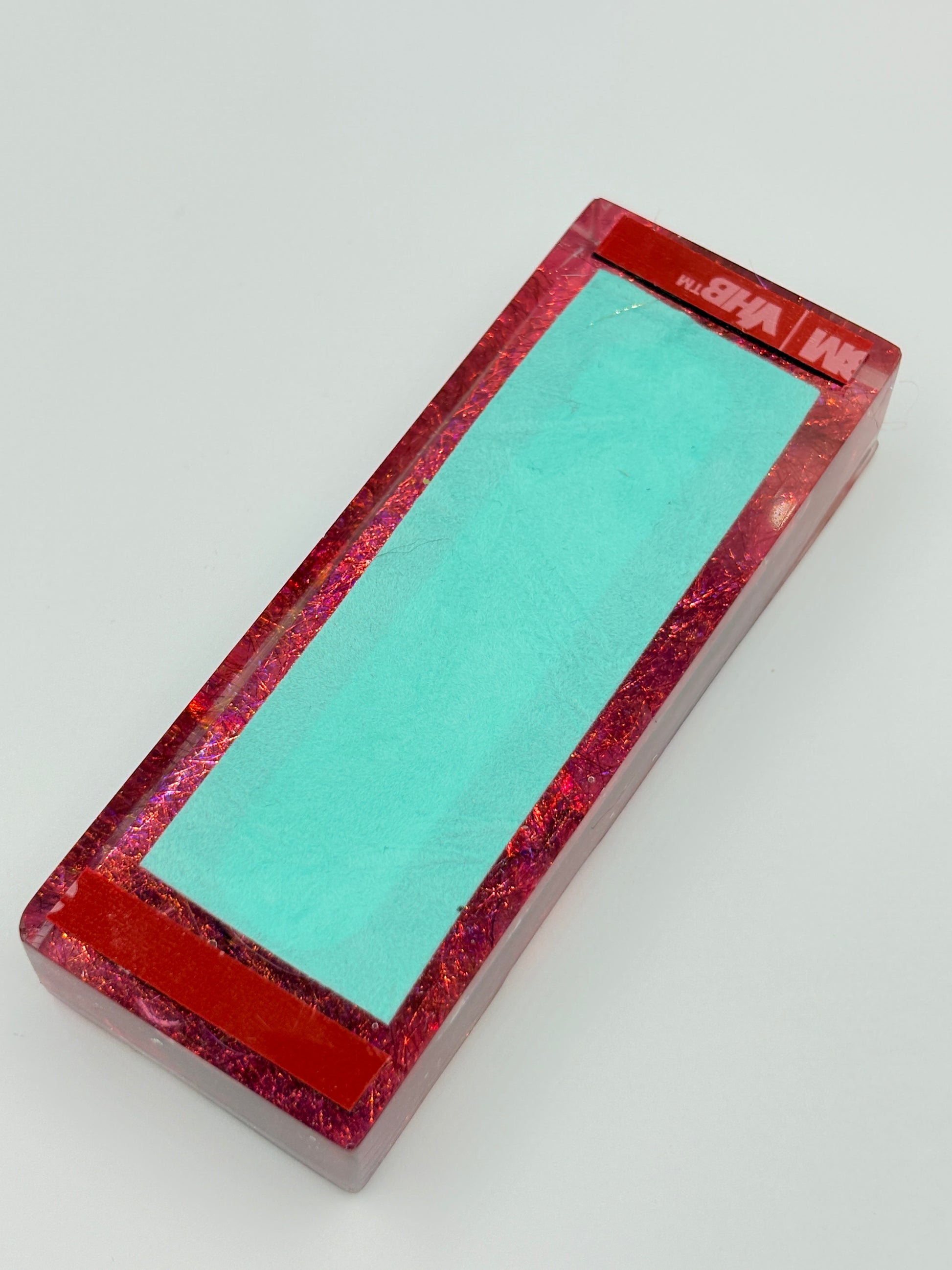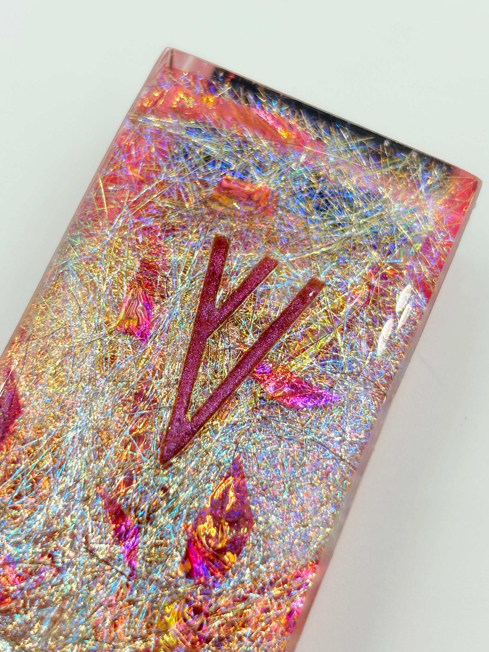 This one-of-a-kind mezuzah combines traditional Jewish craftsmanship with contemporary artistry. Hand-crafted from resin and enhanced with dichroic film, each piece features unique embossed patterns that catch and refract light in captivating ways. The vibrant, colorful design makes a striking statement while honoring the sacred blessing contained within. Measuring 1.5" x 4", it's perfectly proportioned for doorway installation. An exceptional choice for those seeking a meaningful, visually distinctive piece that celebrates both faith and artistic expression. Selfstick adhesive on backfor hanging.
