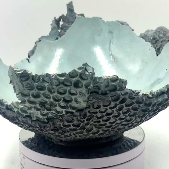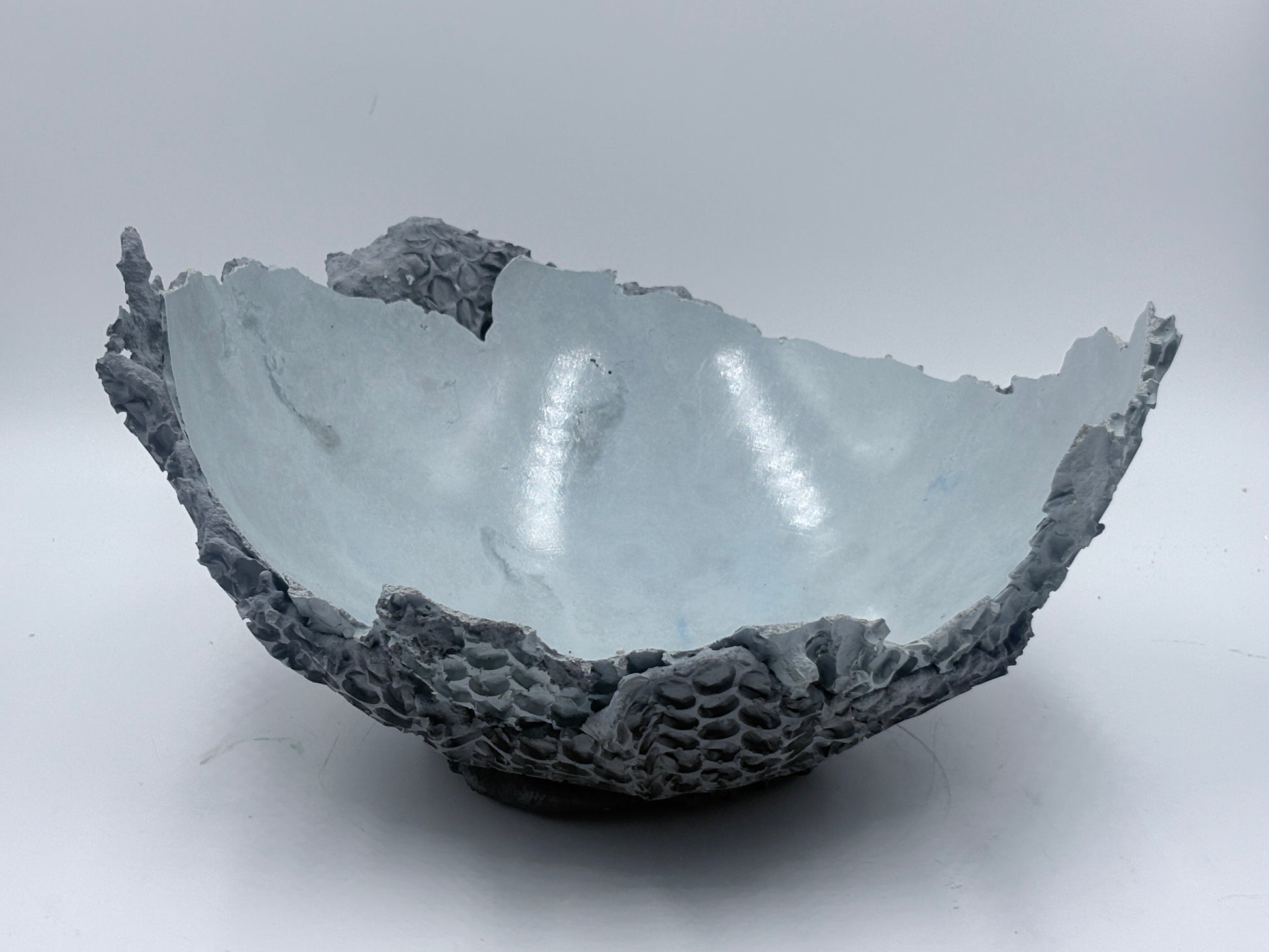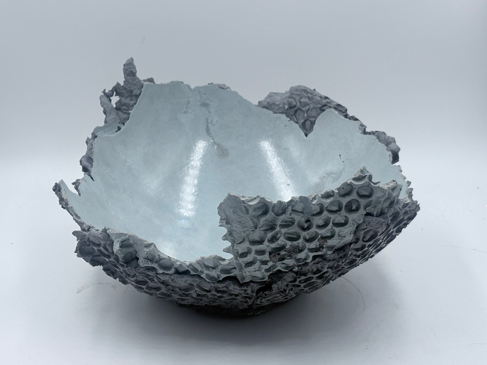 This expertly crafted concrete bowl features a distinctive indented circle texture on its grey exterior, contrasting beautifully with a smooth blue interior. Measuring approximately 10 inches in diameter and 5 inches in height, its round form makes it a versatile piece for home decor. Ideal for adding a modern, tactile element to any space, this bowl combines durability with refined design.