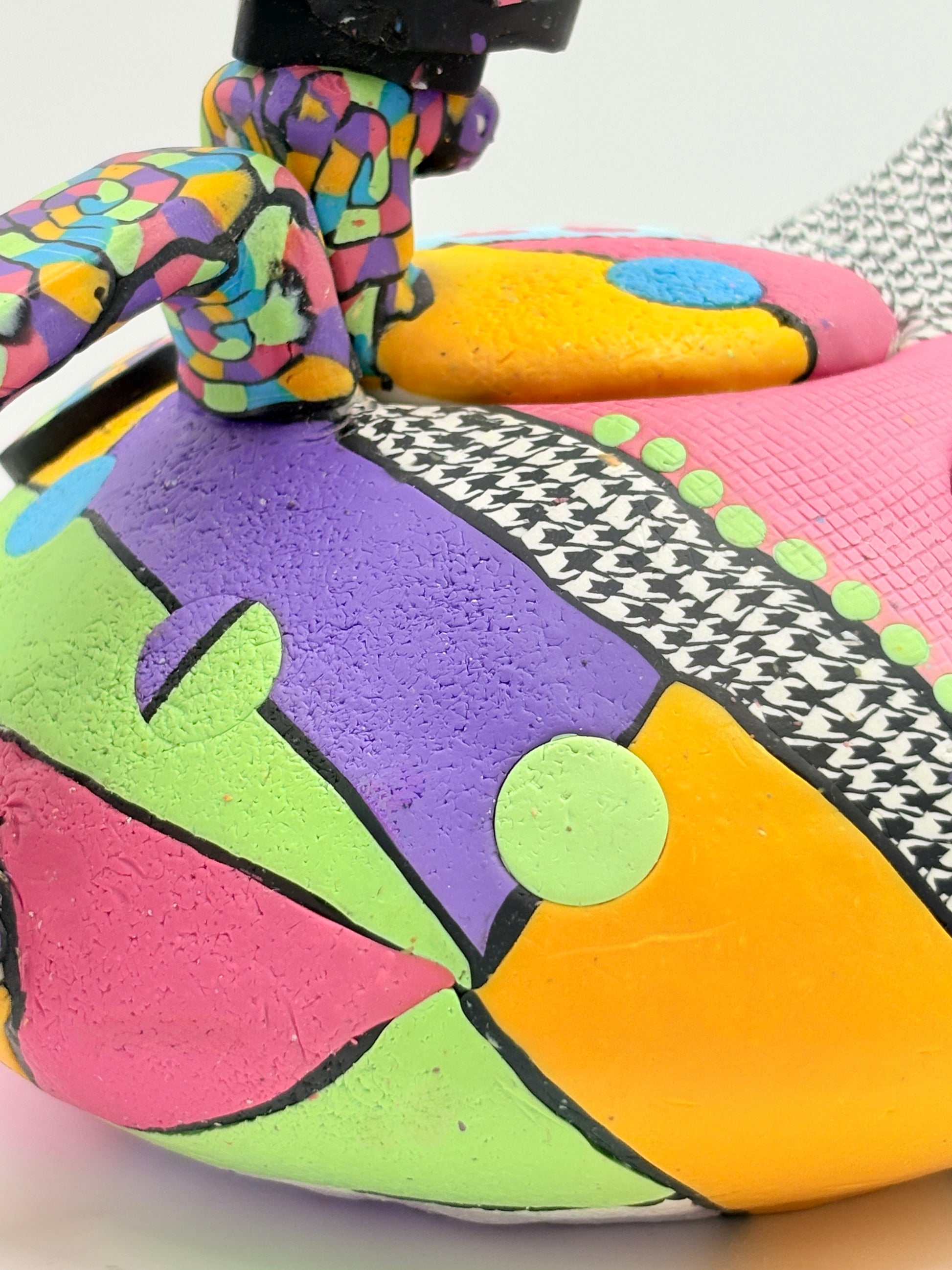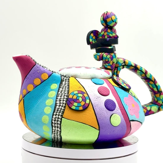 This one of a kind whimsical teapot merges functional design with artistic expression, featuring a polymer clay exterior layered over a ceramic core. Its vibrant, imaginative aesthetic draws inspiration from Alice in Wonderland's enchanting world, making it a conversation-starting centerpiece for any kitchen or tea service. The colorful detailing showcases meticulous craftsmanship, while the durable ceramic interior ensures reliable performance for brewing your favorite teas. Perfect for collectors who appreciate functional art that celebrates creativity and storytelling.